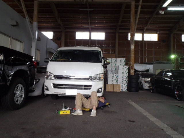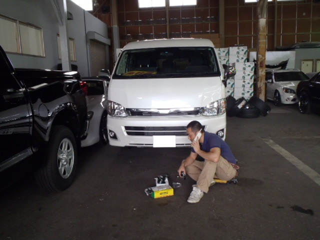 ハイエースの作業中にお客様から電話でお話中の上田さん