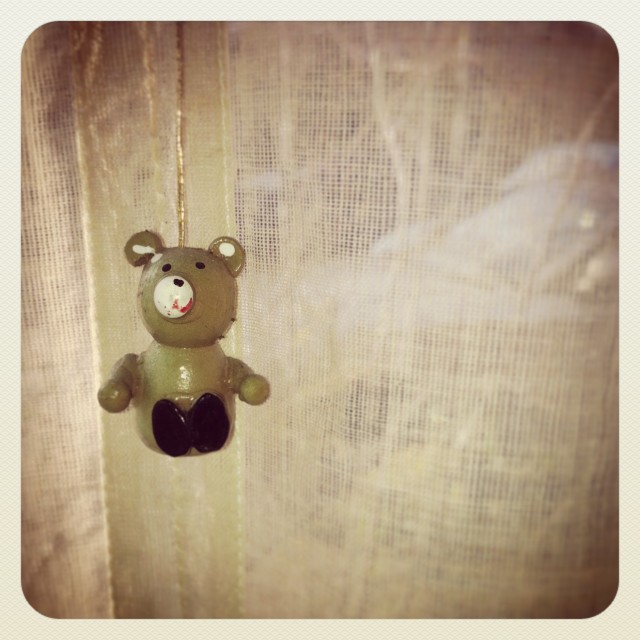 店内のカーテンにクリスマスツリーの飾りがたくさん