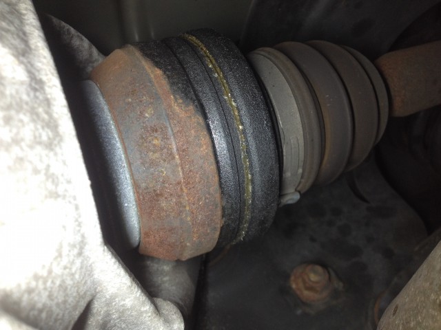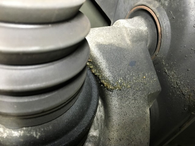 実はコレ、CVジョイントのブーツが破れているわけではなく、ブーツよりまだインナー側のジョイントカシメ部よりグリス漏れ。