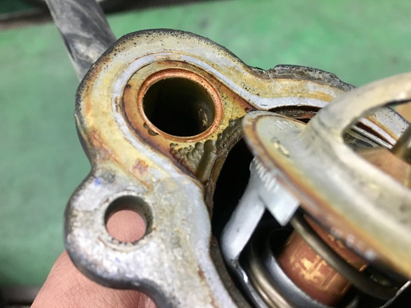 サーモスタットハウジングが装着される箇所は、メタル製のガスケットが装着されるのですが、現車の取外したガスケットは中のシールが劣化により破れてしまっており、そのせいで冷却水漏れ…
