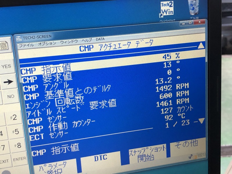 Tech2を接続してECM(エンジンコントロールモジュール)に入力されているDTC(故障コード)を確認すると、CMP(カムシャフトポジションシステム)機能に対するエラーが発生しています。
