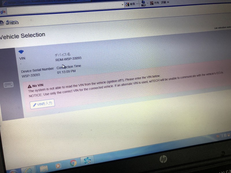 セキュリティが発砲している状態のまま、イグニッションONにてwiTECH2.0(ワイテック2)を接続してみるも、現車とテスターがコミュニケーションを取れない状態。