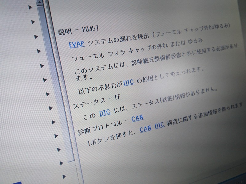弊社に作業入庫する前に、念のため新品のフューエルキャップに交換したけれども改善されず…フューエルキャップが機能していないと車両側は検知しています。