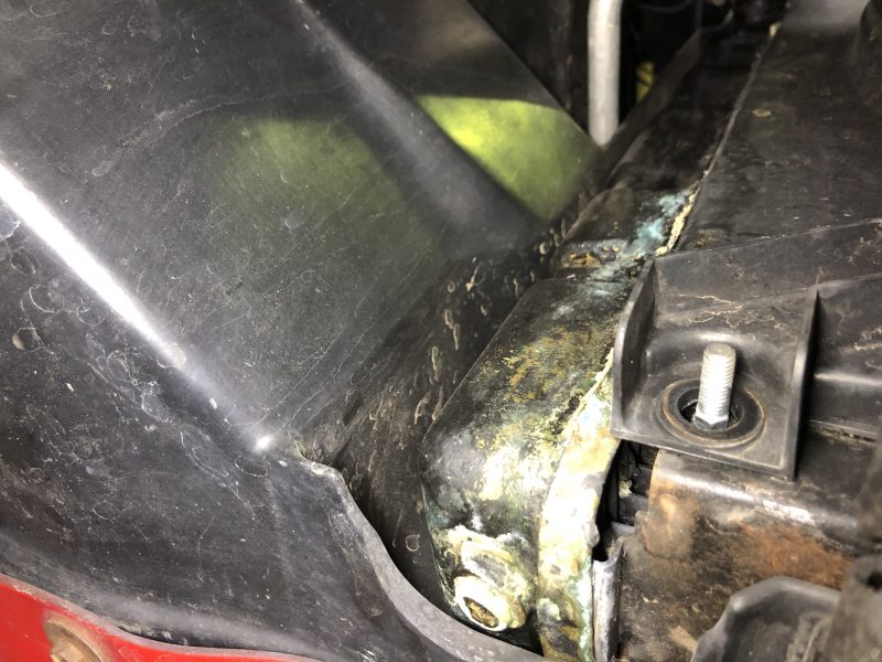 リフトアップして確認すると、経年劣化によってラジエターが腐食している状態です。