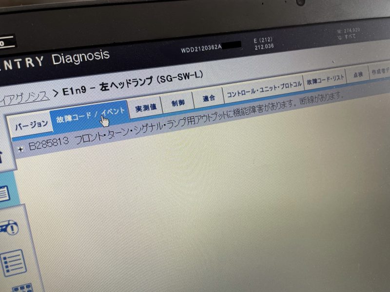 XENTRYテスターによるDTC(故障コード)診断では、左フロントランプのアウトプット機能障害=ライト側に問題が発生していると判明。
