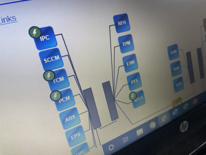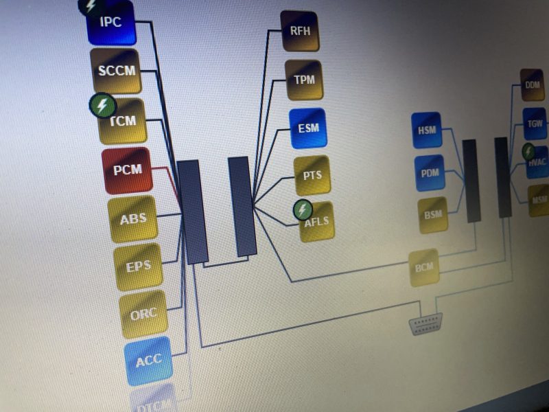 念のためwiTECH2.0テスターを接続して確認してみると、CANネットワークの多くのユニットがPCMと通信喪失エラーを検知し、トポロジー画面でもPCMだけが赤くスリープしているのが判ります。