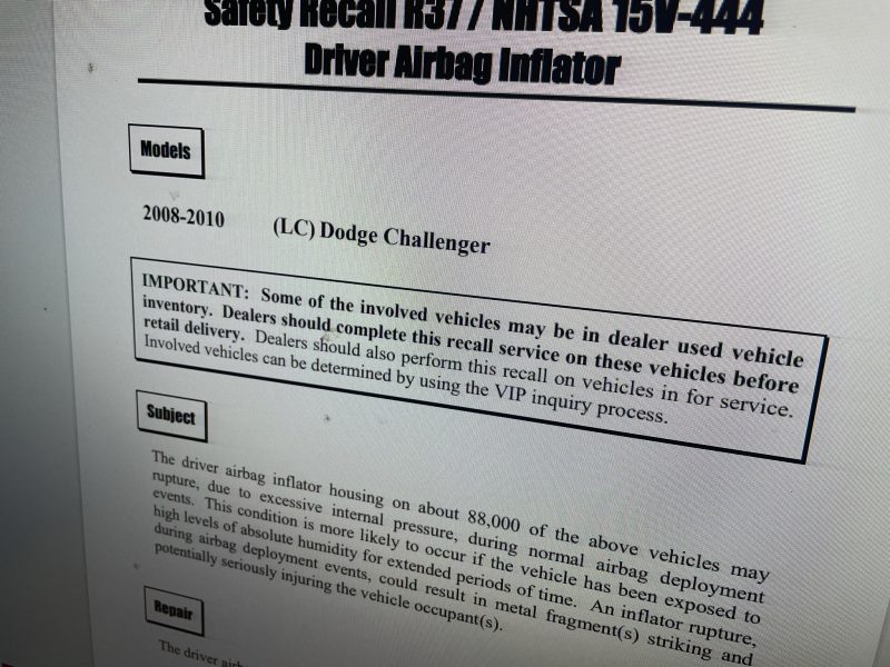 この年代の多くのクライスラー/ダッジでは、タカタ製エアバッグに対するリコールが本国では存在しています。