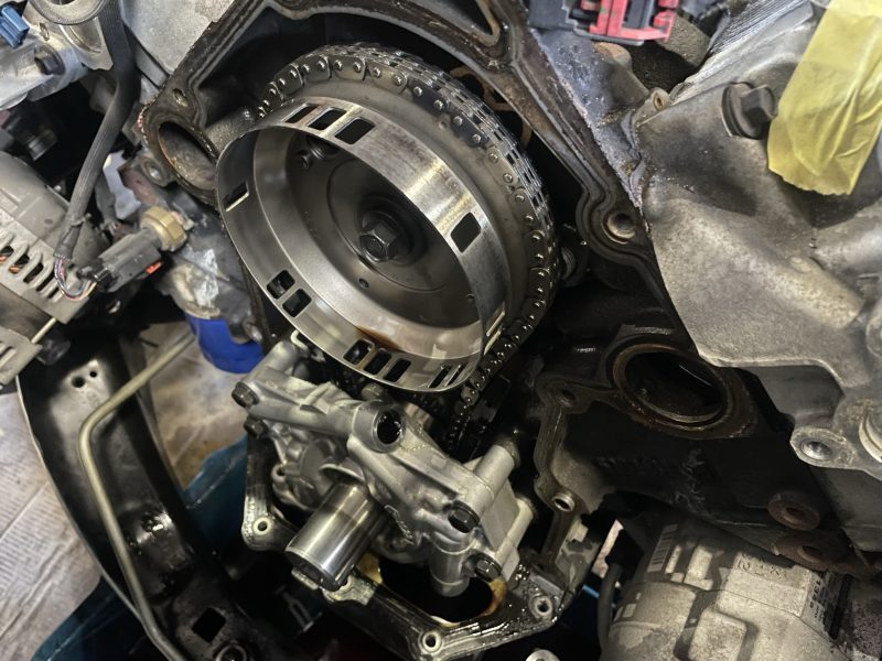 エンジンフロント周りを分解し、フロントタイミングケースのシールガスケットの組み換え作業です。