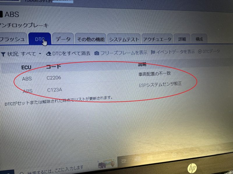 ECUの車両構成を一致させるため、テスターを使用して車両設定データーの入力処置を行って、新たなABSモジュールのセットアップ処理。