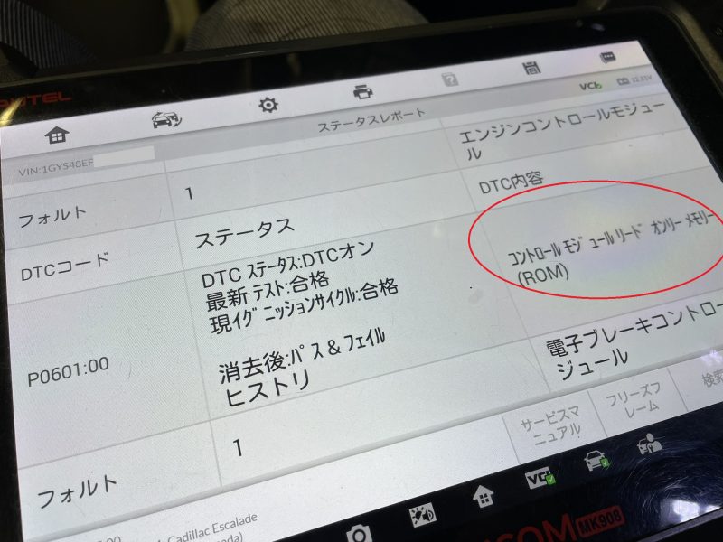 ECM(エンジンコントロールモジュール)のDTC(故障コード)を確認すると、コントロールモジュールのリードオンリーメモリーを検知しています。