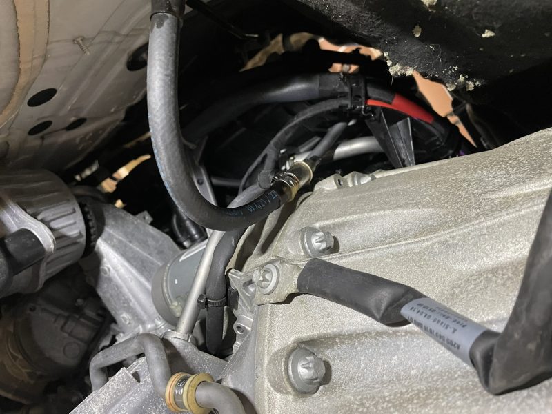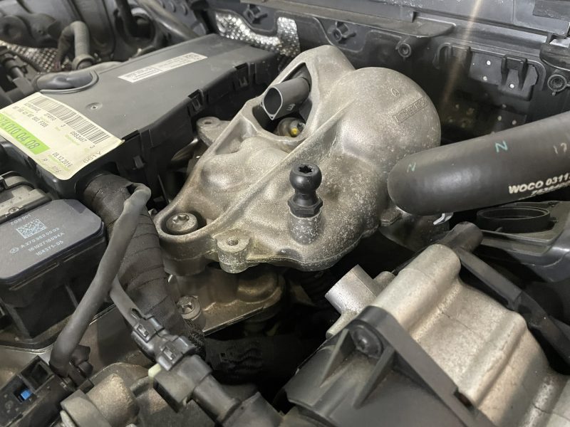 M274系エンジンでは非常に多いハイプレッシャーポンプのインレットホースからのガソリンリーク、確認するにはまず上部のアルミカバーを取り外すことになります。