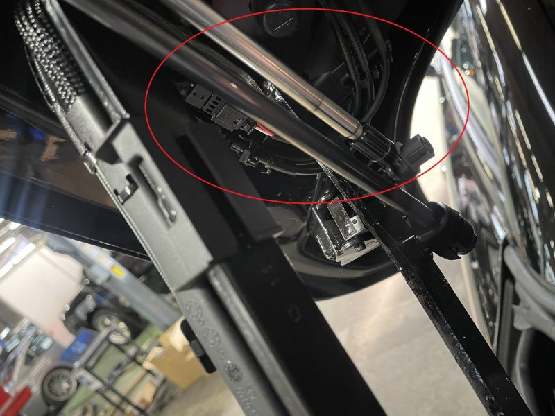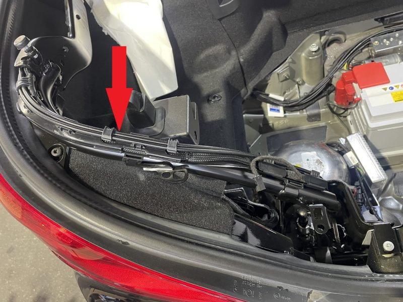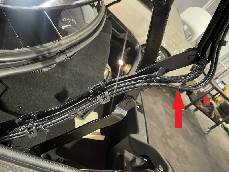 トランク両ヒンジに取り付けられているシリンダーのハイドロリックラインは、トランクの開閉部を添うように取り回されハイドロリックポンプに接続されています。