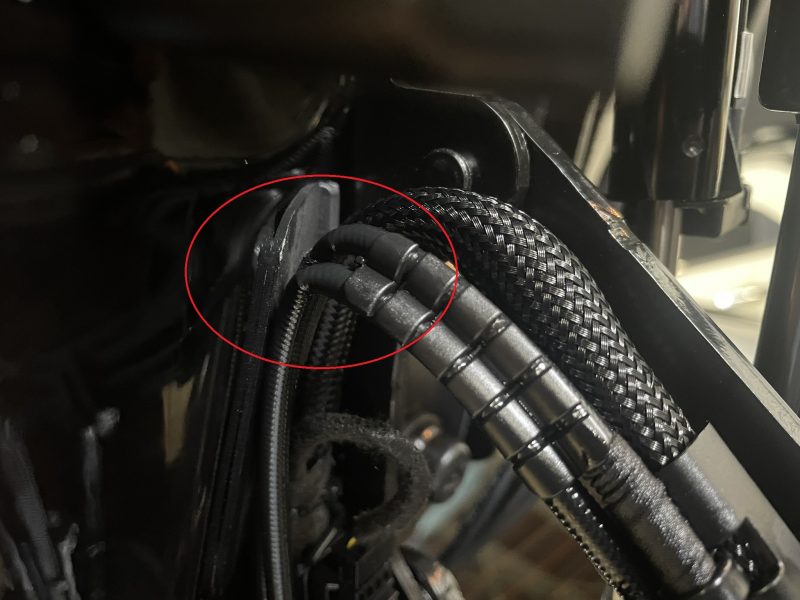 またシリンダーに導かれるハイドロリックラインもR部に折れがみられるため、併せて交換作業を行います。