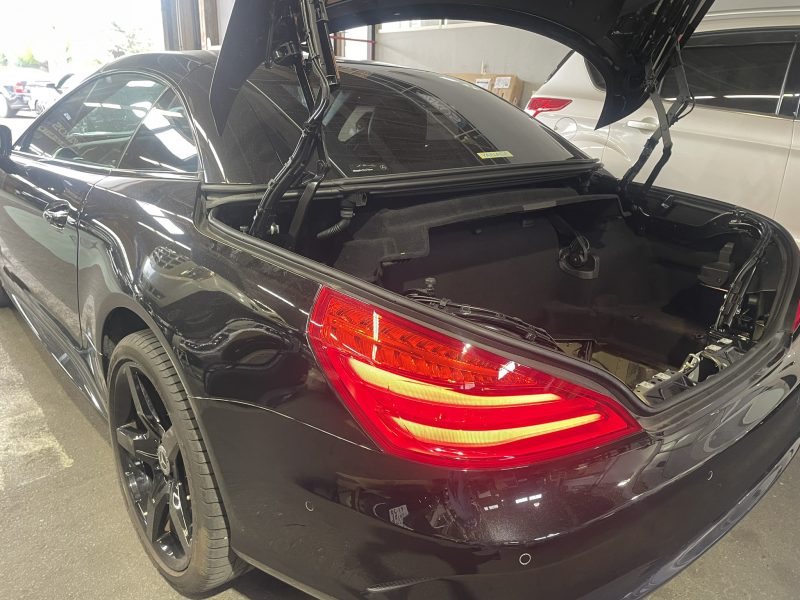 トランクを開けるとトランク内にオイルが漏れ垂れた痕跡がある、R231モデル/ベンツSL400の修理作業です。