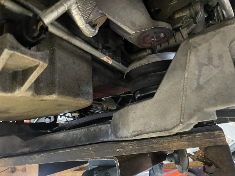 コルベットはトルクチューブシャフトがある為にエンジン側を上げることが出来ないので、エンジンハンガーでエンジンを固定して、マウントのスタッドボルトがかわせる範囲内までサスペンションメンバーを下げて組み換えします。