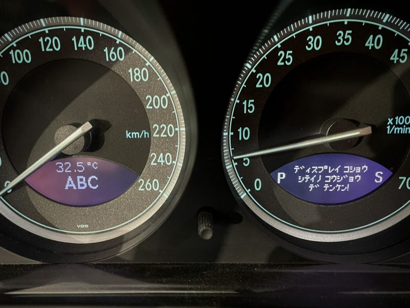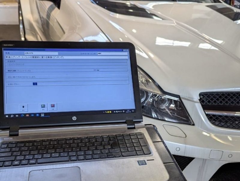 メーターディスプレイにABCシステムの故障警告が表示される、R230後期のベンツSL500の修理です。