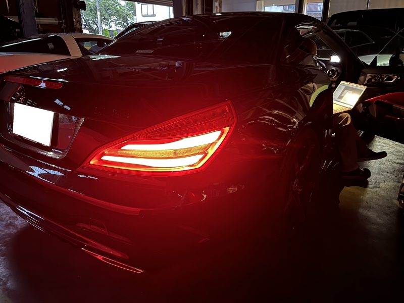 今回ご入庫頂いたR231モデル/ベンツSL63、前にオイル漏れ修理をした後からバックシフトアラームが鳴らなくなった…という案件にて点検作業の実施です。