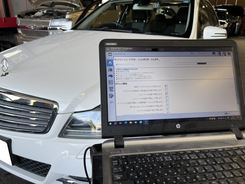 ご遠方にもかかわらず、「エアポンプ機能の無効化」コーディング処置にて、この度初めてUGへご来店頂いた、W204モデル/ベンツC180のクイック作業です。