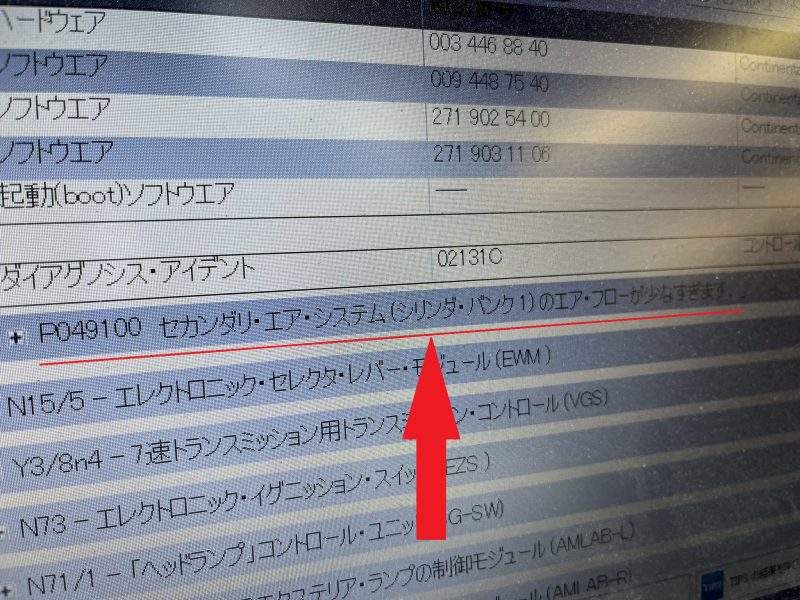 現車はセカンダリエアシステムのエアフロー過少によりDTC(故障コード)を検知し、チェックエンジン警告ランプが点灯した状態に陥っています。