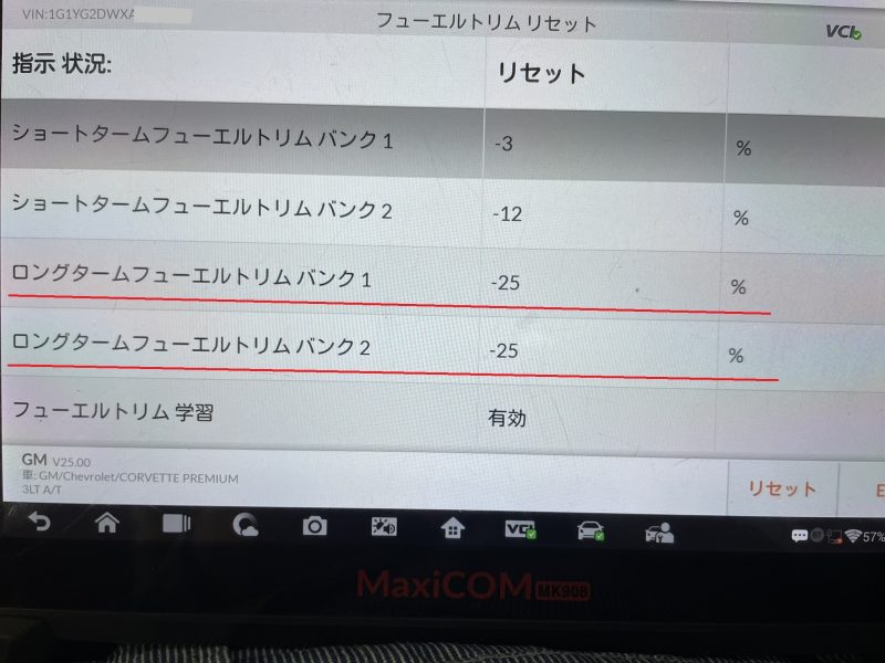 現車はフューエルトリム値をいったんリセットしても、すぐにマイナス方向(リッチ)へと数値が上昇し限界値まで達してしまう状態です。