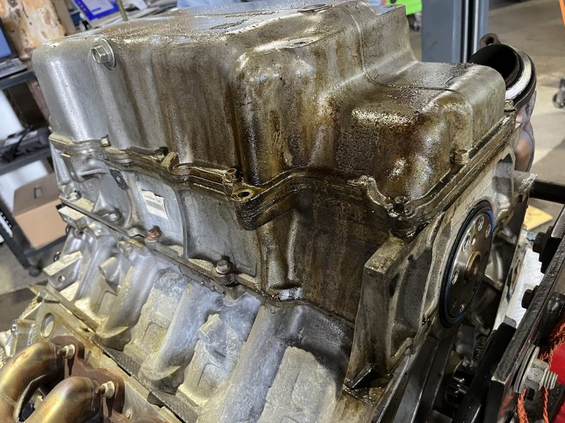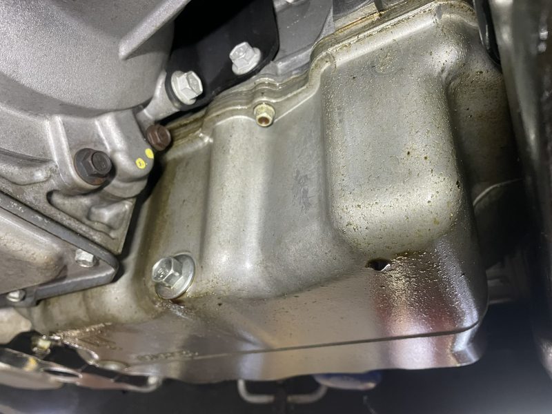 リフトに上げて下廻りを確認すると、エンジンオイルパン周辺からオイル漏れが発生しているのが判明。