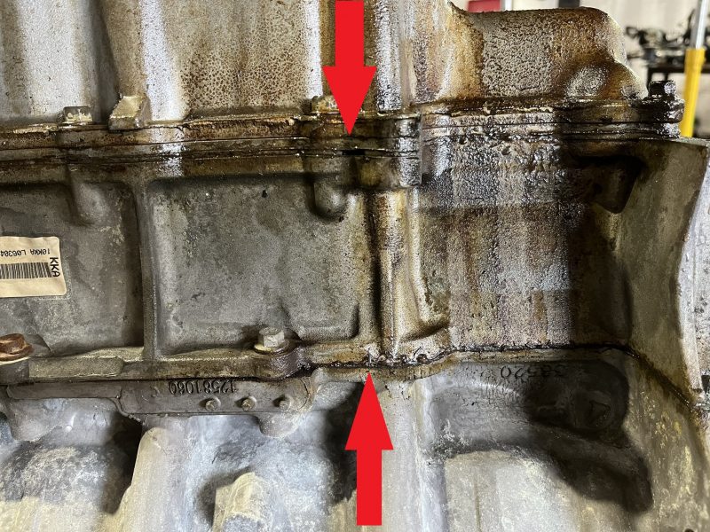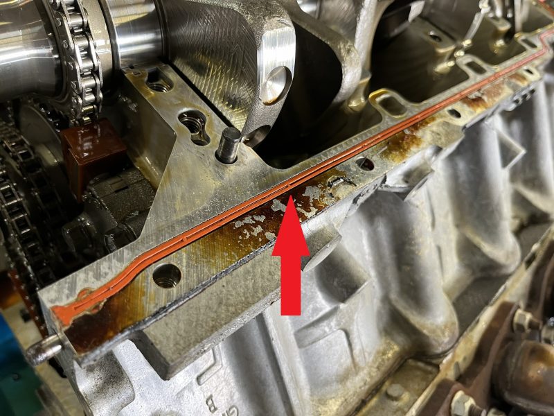 するとオイルパンガスケット(画像矢印上側)が装着されるオイルパン面よりも、さらに上の接合面(画像矢印下側)からもオイル漏れが発生しているのが判明。