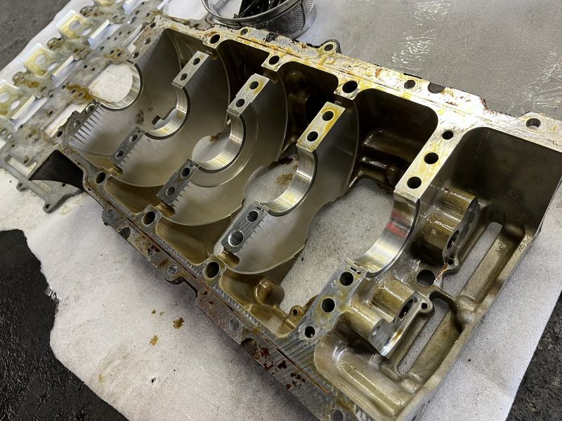 各シリンダーボアが設けられたアッパーブロックと、一体式クランクキャップとなるロアブロックとの間には、もちろんシールガスケットが存在しているので、こちらも併せて組み換え作業となります。