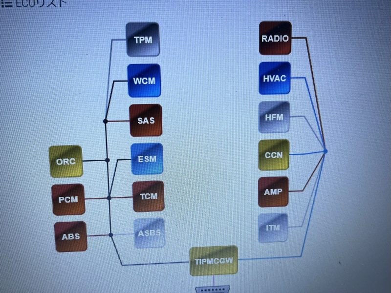 しかし、症状発生時にwiTECHでのトポロジーモニターを確認すると、エンジンを制御するPCMをはじめ、TCM(トランスミッションコントロールモジュール)やABSそしてSAS(ステアリングアングルセンサ)等の主要なECUが起動しない状態に陥っています。