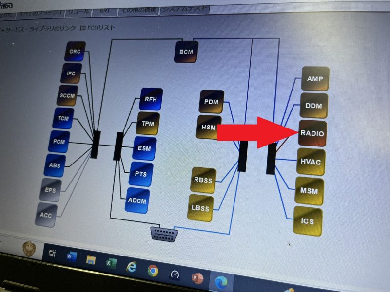 このラジオユニットは車両のテレマチックスゲートウェイとなる為、ラジオユニットが起動しない=テレマチックスゲートウェイの通信喪失によって、ブラインドスポットモジュールが正常に制御できなくなっているトラブルと予測できます。(ドアミラーレンズの警告アラートも点灯したままの状態です)