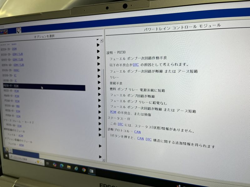 DTC(故障コード)を確認すると、フューエルポンプ回路の作動不良を検知しています。