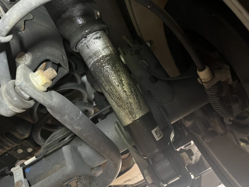 特に足回りの異音等が気になる…リフトアップして確認すると、リアのショックアブソーバーからオイル漏れが発生しています。