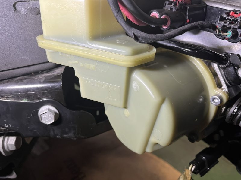 交換作業後は油圧ポンプとなので、もちろんパワーステアリングフルードの充填が必要ですが、ベルト駆動式のパワーステアリングポンプとは異なる専用のフルードが必要となります。