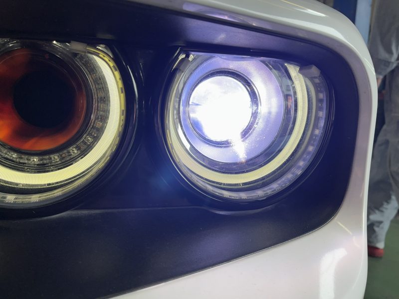 車検整備にてお預かりしたLAモデル/ダッジチャレンジャーSRTですが、片側のヘッドライトが点灯しない状態です。