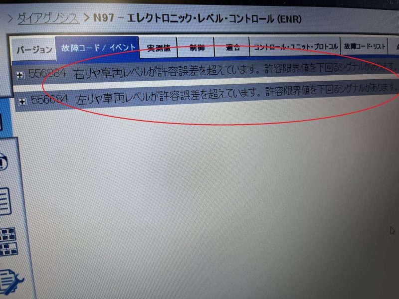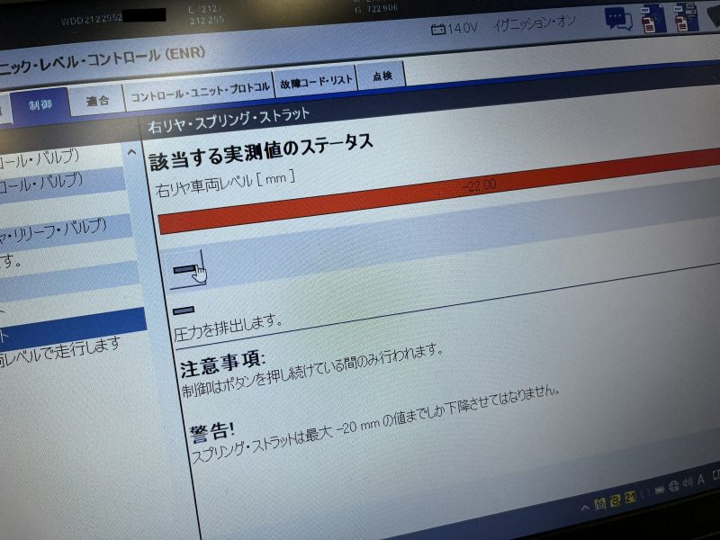 車両レベルが低下する原因は、いわゆる「エア漏れ」等のリークトラブルが大半を占め、エアスプリングやバルブブロック等のリーク点検を必要とします。