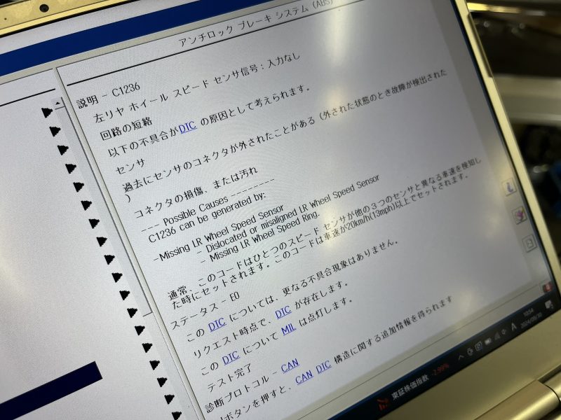 IDS診断機にてDTCを確認すると、左リアホイールスピードセンサーの不具合を検知しています。