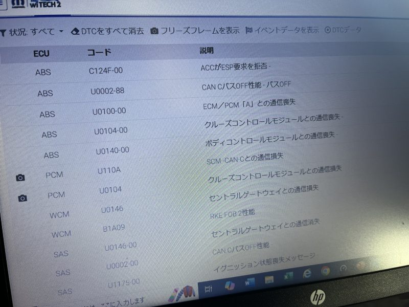 上記状態によりABS/トラクション警告点灯はもちろん、ACCとの通信喪失によってチェックエンジン警告も点灯してしまっています。
