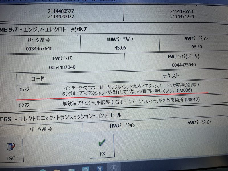 点検作業にてお預かりした、W211モデル/ベンツE250のテスター診断です。