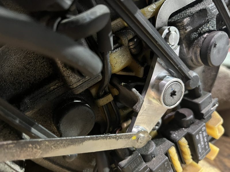 このバキュームアクチュエーターのロッド動作により、レバーを介して左右インテークポートを連動させているのですが、この樹脂製レバーの劣化損傷によりアクチュエーターロッド取り付け部が割れてしまうトラブルが非常に多く存在します。
