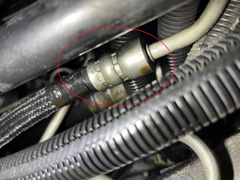 漏れ箇所を点検すると、パワーステアリングラインの高圧ホース部/カシメ部より激しく漏れてきているのが判明。