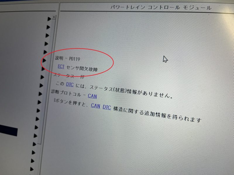 IDS診断機にてDTC(故障コード)を確認すると、ECT(エンジンクーラントテンプ)センサーの間欠故障を検知しています。