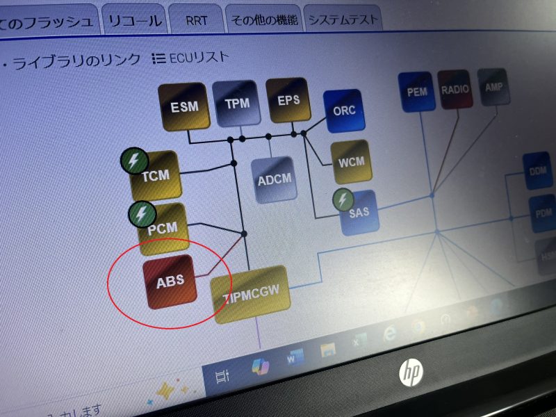 wiTECH診断機のトポロジーモニターを確認すると、ABSモジュールが通信喪失状態。