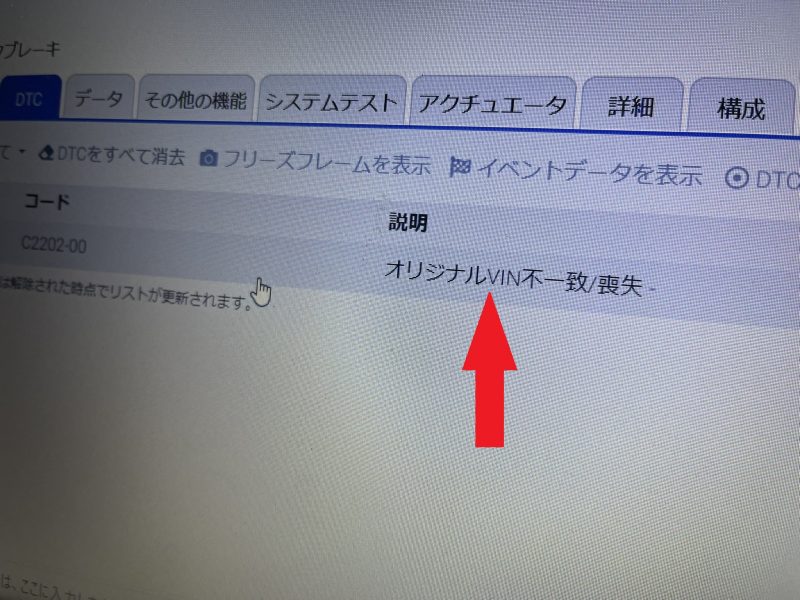 他車に取り付けられていたABSモジュールに交換しただけでは、ECUにプログラムされているVIN(車体番号)不一致によりDTC(故障コード)を検知してしまい、制御を行わずに警告ランプが点灯したままの状態です。