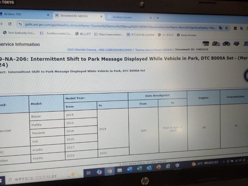 シフトレバーがPポジションにも関わらず、駐車時に時折「Shift to Park」とディスプレイに表示されてしまう、2019yシボレートラバースの点検です。