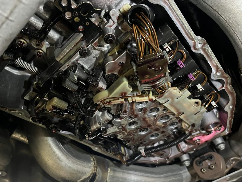 この8L系ATミッションには、レベルゲージパイプやフルード排出用ドレンが存在しないので、フルードを排出する際はオイルパンを取り外す作業となります。
