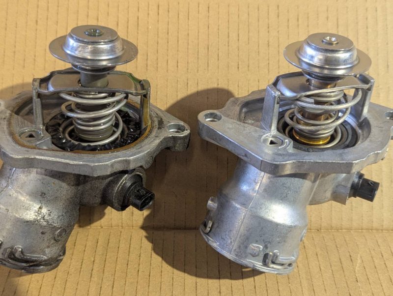 サーモスタット弁の密閉度上げる為にゴム製のシールパッキンがディスクに取り付けられているのですが、経年劣化によってシールが「ふやけた」状態になり=密閉度低下によりリークしてしまう為、水温の上昇時間が遅くなってしまいます。