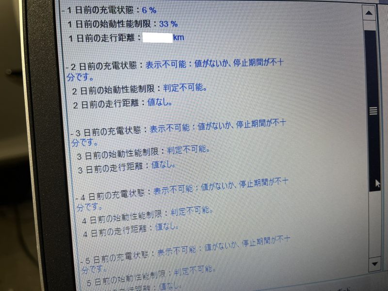 測定診断を進めると、オルタネーターの発生電圧が著しく低い時があり、現車に記録されている充電状態履歴を確認しても、そのあたりの不具合による症状が確認取れます。