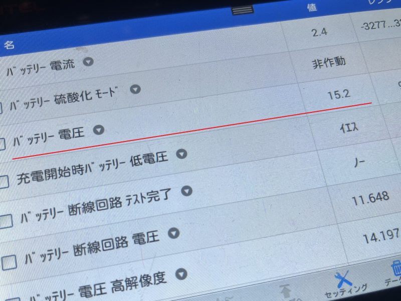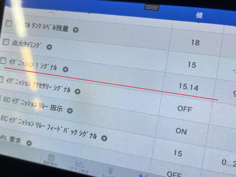 測定の結果、実際のバッテリー電圧はもちろん、ECM(エンジンコントロールモジュール)が検知しているシグナル電圧値も全く問題ない数値を示しています。