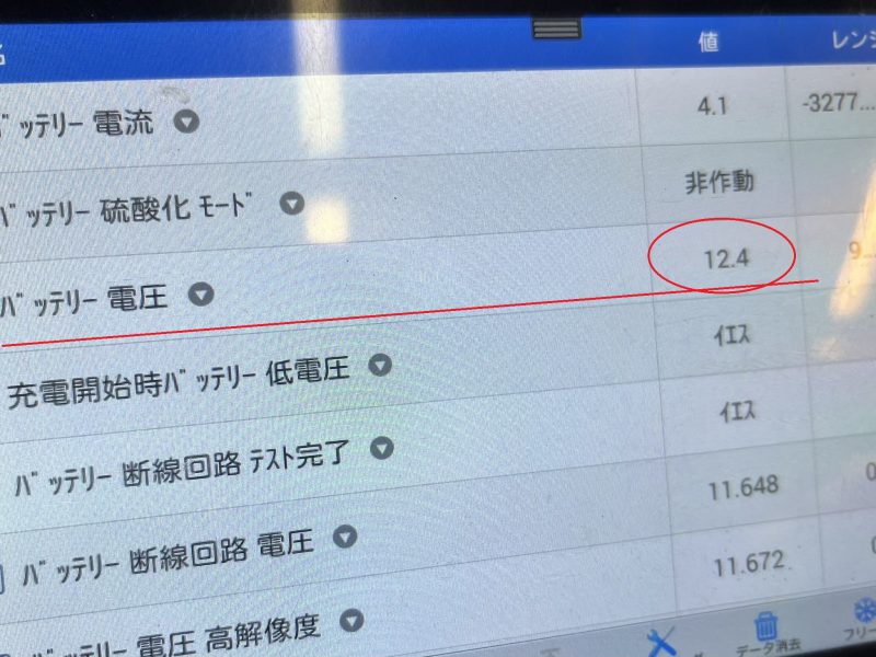 テスターにてDTC(故障コード)を確認すると、バッテリー電圧低下に伴うエラーを検知しています。