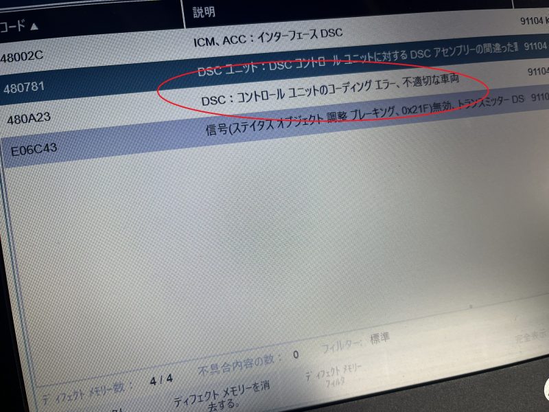 現車は車体番号の異なる中古部品へと交換している為、DSCコントロールユニットに対し「コーディングエラー」のディフェクトメモリが検知されてしまっている状態です。