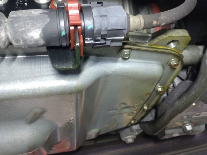 リフトに上げて下廻りを確認すると、エアコンガスに添加されている蛍光剤がミッション周辺に漏れ垂れた痕跡が残っています。